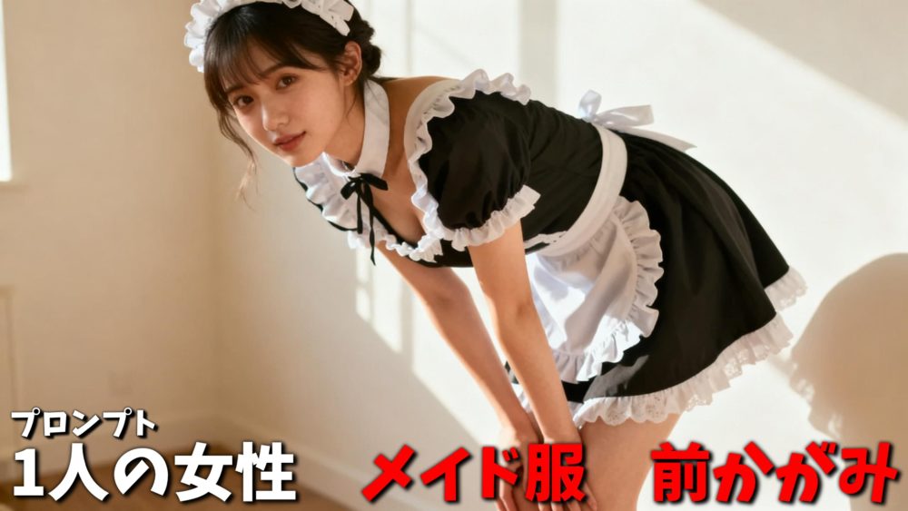 現実で滅多にみることがない「メイド服」を少しセクシーに見せたい場合は「前かがみ」のプロンプトと組み合わせてみましょう。